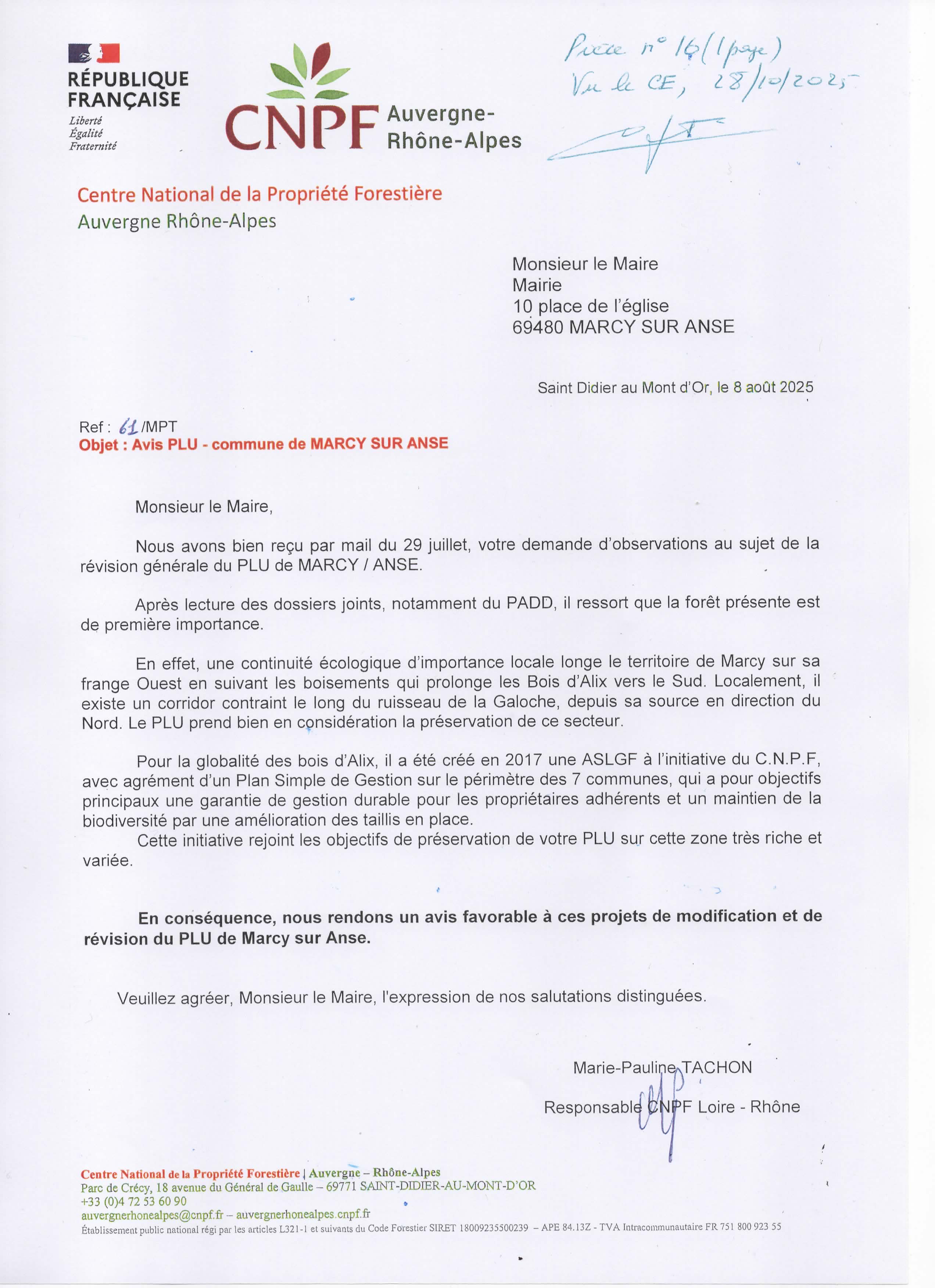 16-Avis du Centre National de la Propriété Forestière concernant le projet de révision du PLU de Marcy-sur-Anse