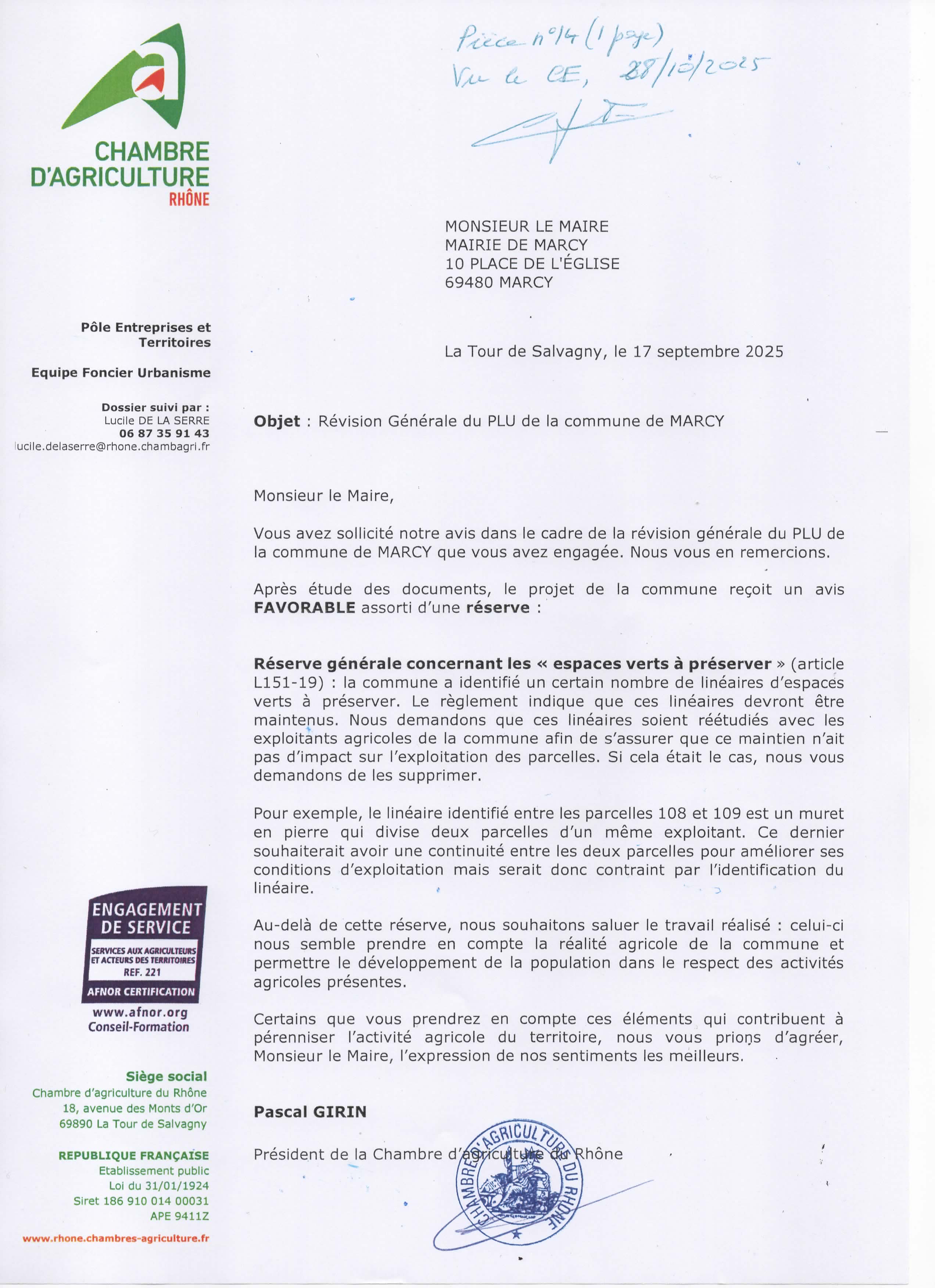 14-Avis de la Chambre d’agriculture concernant le projet de révision du PLU de Marcy-sur-Anse