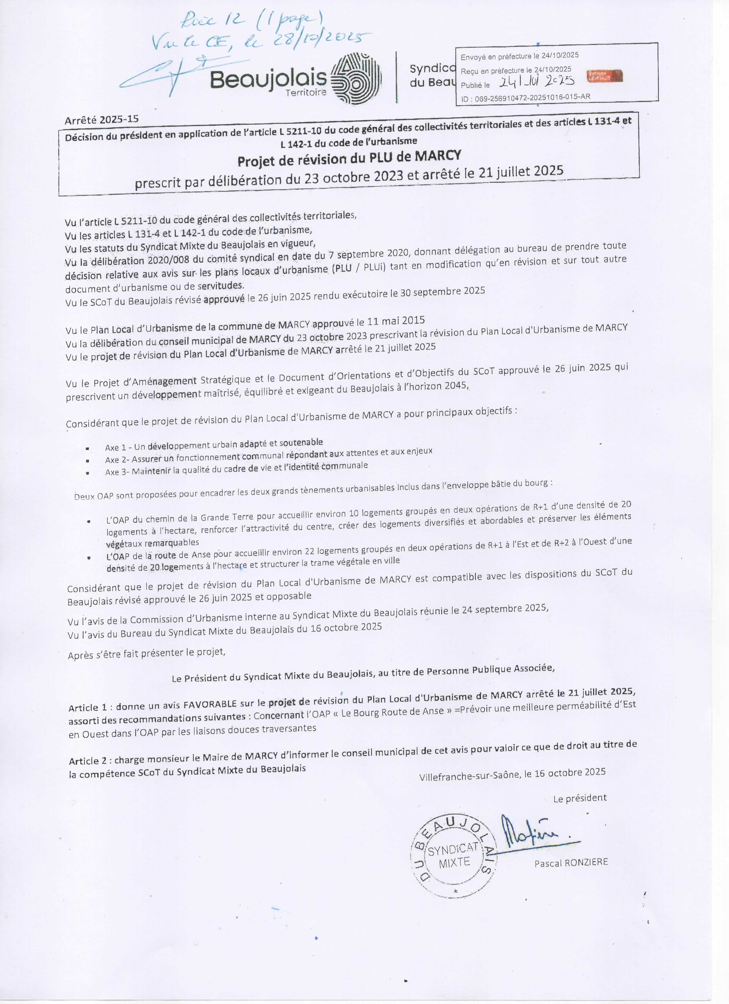 12-Avis du Syndicat mixte du Beaujolais concernant le projet de révision du PLU de Marcy-sur-Anse