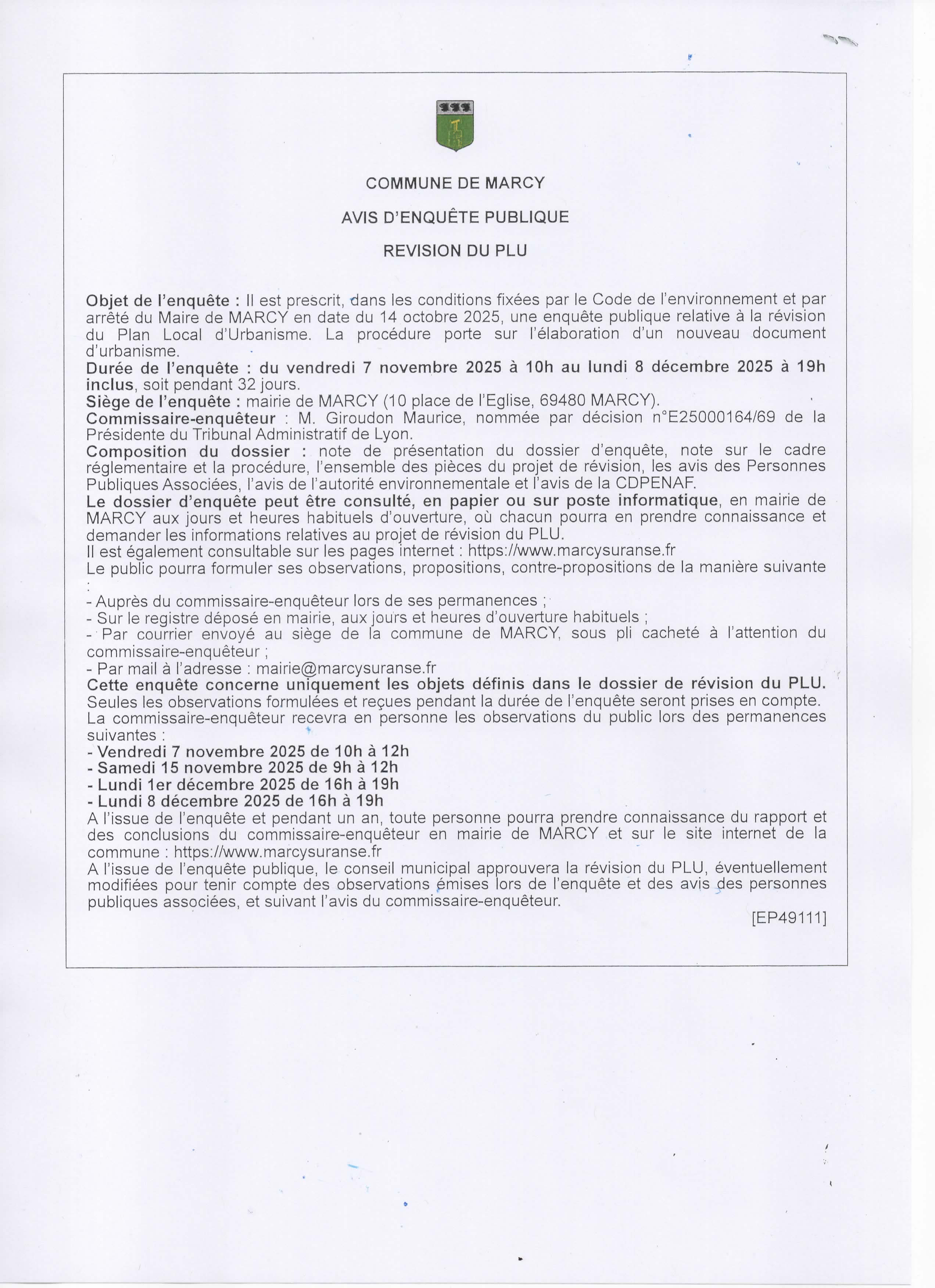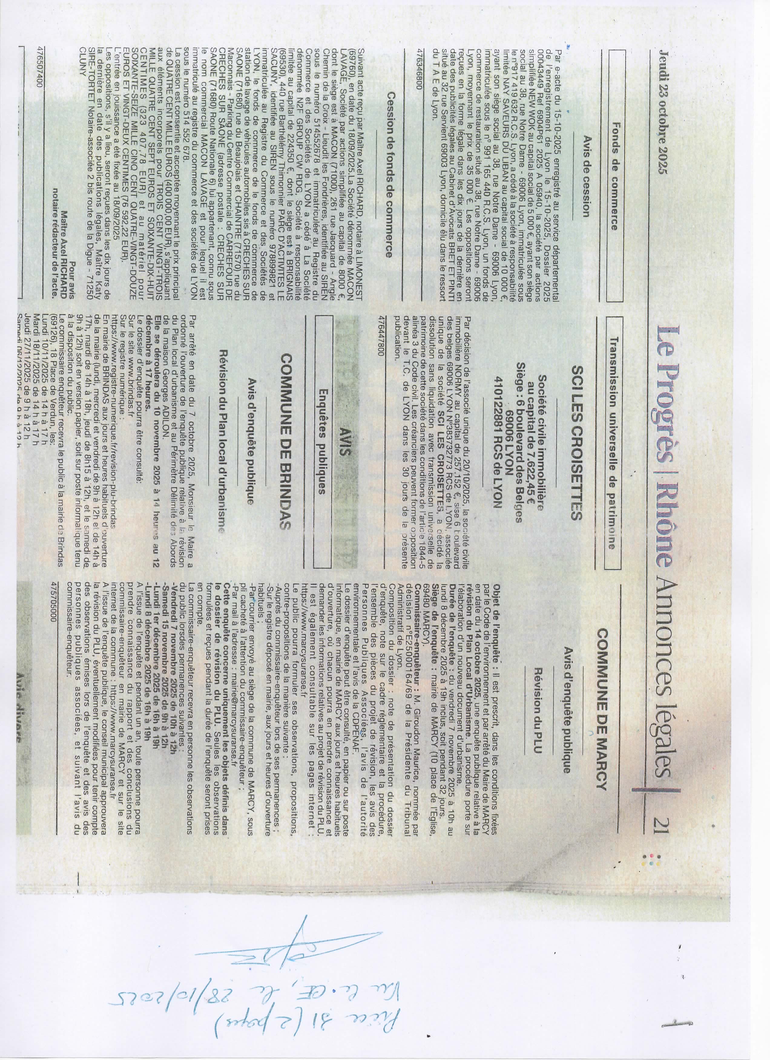 31-Le Progrès – Avis portant ouverture de l’enquête publique ayant pour objet le projet de révision du PLU de Marcy-sur-Anse