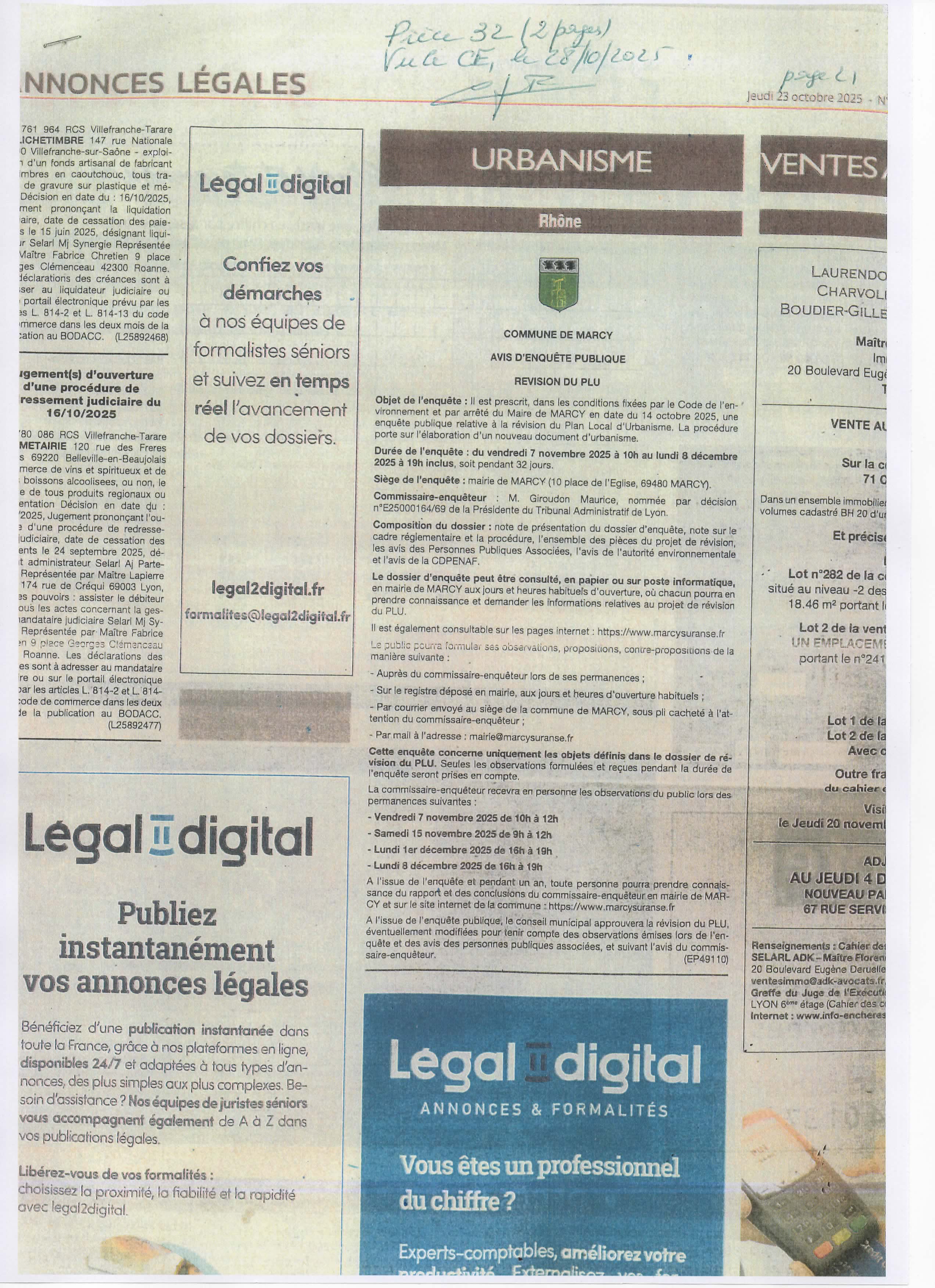 32-Le Patriote – Avis portant ouverture de l’enquête publique ayant pour objet le projet de révision du PLU de Marcy-sur-Anse