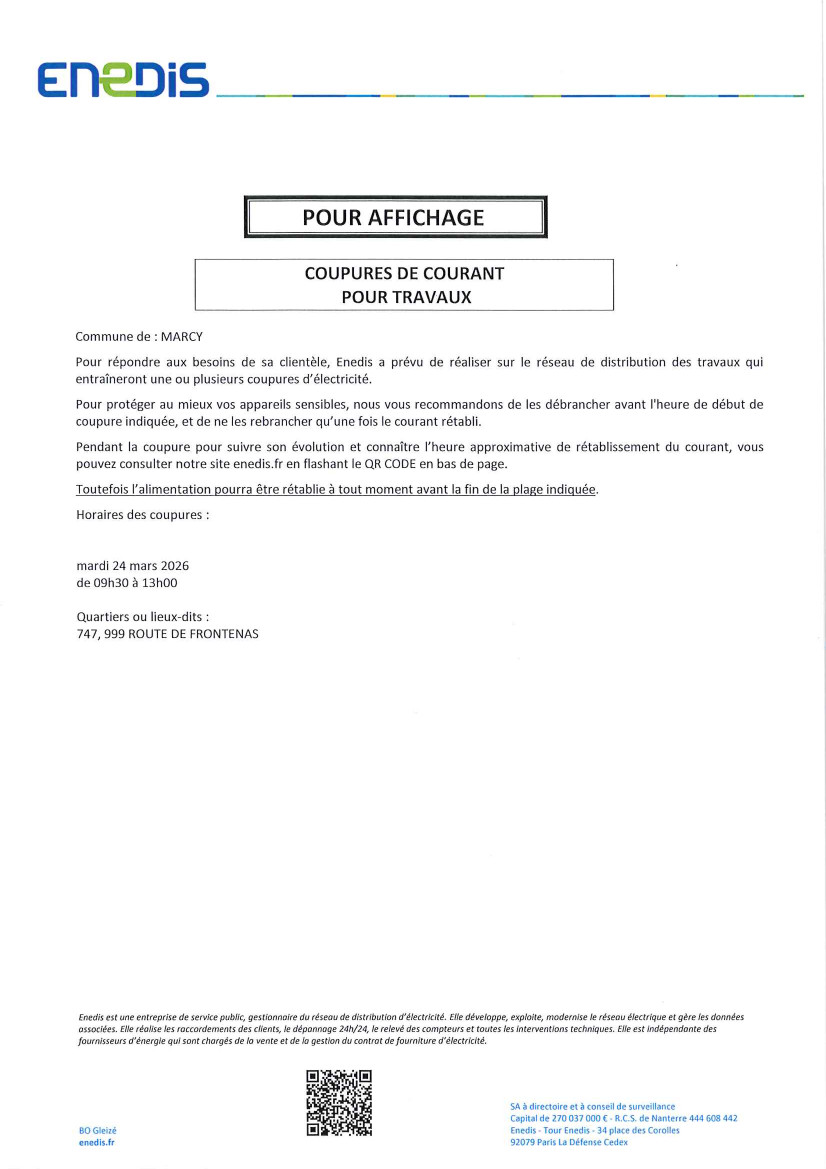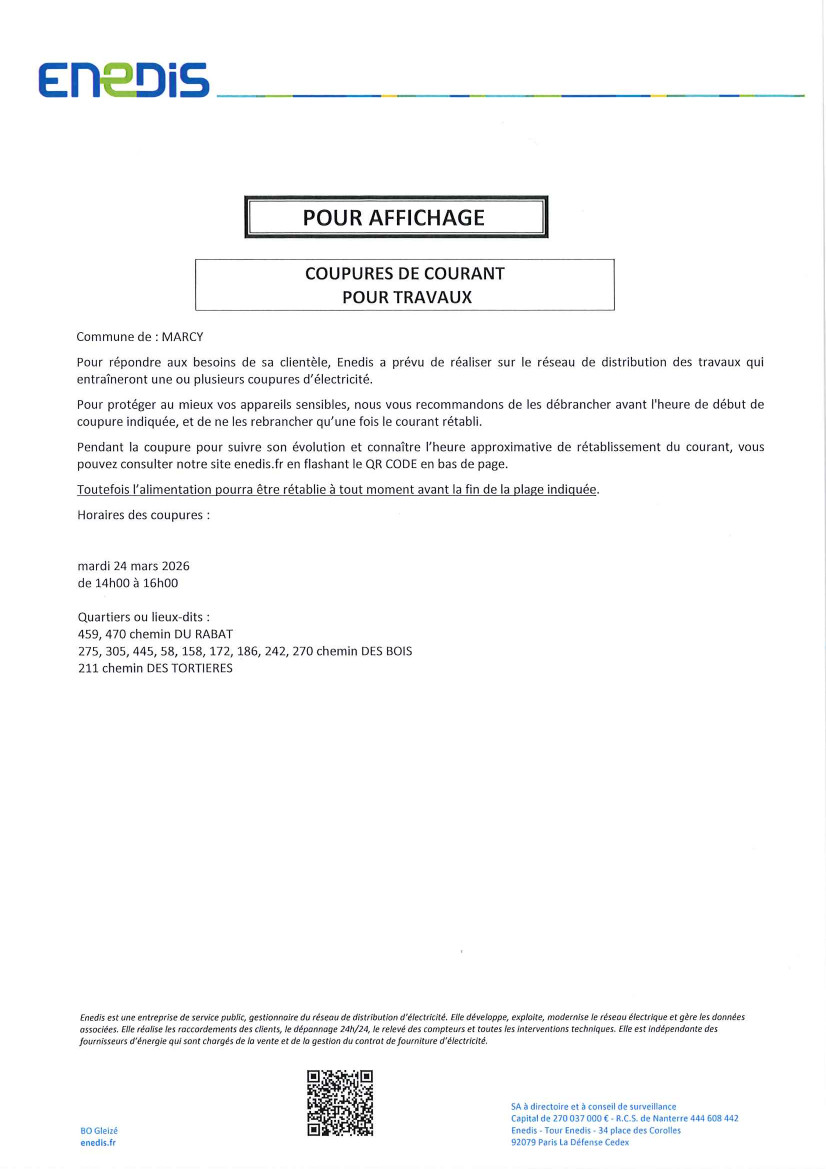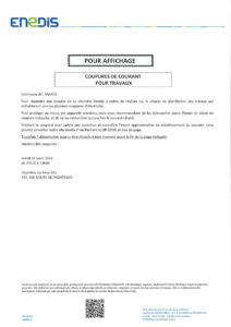 Pendant la coupure pour suivre son évolution et connaître l’heure approximative de rétablissement du courant, vous pouvez consulter le site enedis.fr en flashant le QR CODE en bas de page des documents çi-dessous.